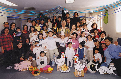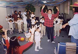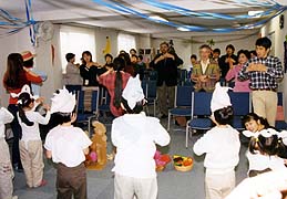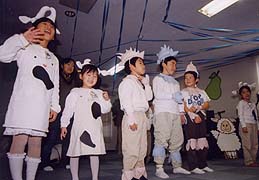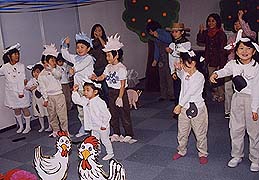 日曜学校では御霊の実についてのコースを3ヶ月間行い、2001年11月14日に発表会がありました。この学びは実践的な学びと歌と踊りがセットになっています。子供達はニワトリや牛の手作りの衣装を身につけてCDに合わせて踊りを披露しました。