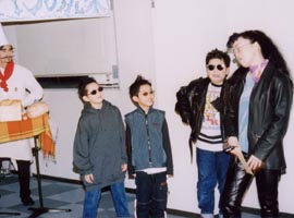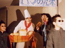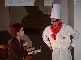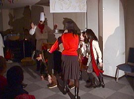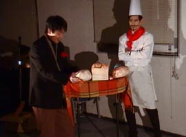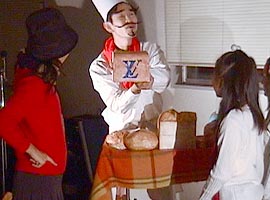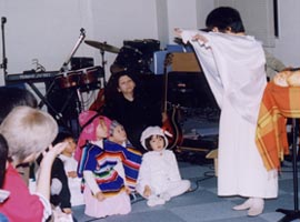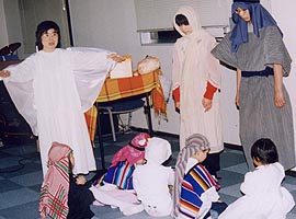 2000年に上演された「パンの家」同じタイトルが今回もつけられていますが、前回のパン屋の主人は良い人でしたが、今回のパン屋さんはサタンの手先で町中に毒を振りまいているのでした。 とある小さな街に「パンの家という名のパン屋さんがありました」彼は悪霊に支配されていました。店の名前は「パンの見栄」といいます。 シーン1: シーン2: シーン3: そこに例のやくざがやってきて彼らは一緒に去っていく。 それを見た妻は悔し泣きをする。 シーン4: パン屋は疲れて寝入ってしまう。そこで不思議な幻を見る。幻の中で羊飼い達が何か騒いでいるようであった。そこに御使いが現れて、ベツレヘムで救い主が生まれた事を告げる。パン屋も彼らについていって救い主の誕生を目撃する。 御使いは羊飼い達に「ベツレヘムとはパンの家という意味である」と告げる。 シーン5: 「ベツレヘムとはパンの家という意味ですよ」という空耳によってパン屋は眠りから覚める おかしな夢を見たなと思いつつ店の掃除を始める。 すると「パンの見栄」という看板が剥がれ落ちて「パンの家」という看板が現れる。 そこに伝道者がやってきて、「パンの家」が復活した事を喜ぶ。当惑している彼にその意味を説明する。 わたしはあなたのおじいさんがこのパン屋を始めたときからこの店を知っています。彼はたいそう立派な人で、人々に慕われて、町中の全ての人がここでパンを買って いました。そして全ての人の祝福になるようにと店の名前を「パンの家」と名ずけたのです。でもあなたのお父さんが後を継いでから、「見栄っ張りの彼は自分のパンに自信があるあまり、店の名前を「パンの見栄」に変えてしまったのです。でも今、やっと「パンの家」が復活したのですね。 パン屋は不思議な夢を見たことを伝道者に告げる。この間、悪霊は信じちゃだめだと妨げようとするが、御使いと悪霊が戦って御使いが勝つ。その結果 伝道者の伝道によってパン屋は救われる。 パン屋は「見栄」という看板の部分を捨てる 以後このパン屋さんは御使いによって守られる。 シーン6: 不良達が再びやって来る。例の物を求めるが、パン屋はもっと良いものを渡す。御使いがそのパンに祝福を与える。 不良達は神に触れられ悔い改めに導かれる シーン7: コギャル達が先ほど知り合ったやくざオヤジの悪口を言いながらやってくる。彼女達に送ったブランド品が偽物だったからである。コギャル達を追いかけてやくざがやってくるが逃げられる。 こんなはずではないと思いながら。パン屋にもっといい物はないかと求める。パン屋は別のパンを渡す。御使いがそのパンに祝福を与える。 パンを受け取りやくざは悔い改めに導かれる。 そこに妻がやってきて仲直りする。 シーン8: その後、同様にコギャル達も悔い改めに導かれる。 シーン9: 救いを喜び、全員でダンスする。