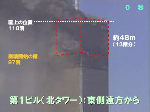このわずかに後の崩壊開始後5秒前後の時点で、第1ビルの「全体像」、「水平崩壊!」と「吹き飛ばされた巨大な壁」 で確認される巨大な質量と体積の物体群が、北西方向に秒速20mを超える速度で水平に吹き飛ばされている のだ。事実を前にしてはどのような誤魔化しも通用しないのである 。