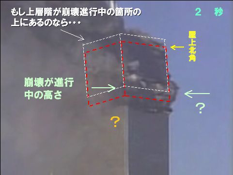 赤い点線で囲まれた部分は崩壊開始箇所よりも上の階(以後、上層階)を表しており、もしもその上層階が破壊されずにそのまま下がったとしたらこの位置に来る、ということを示すためのものである。