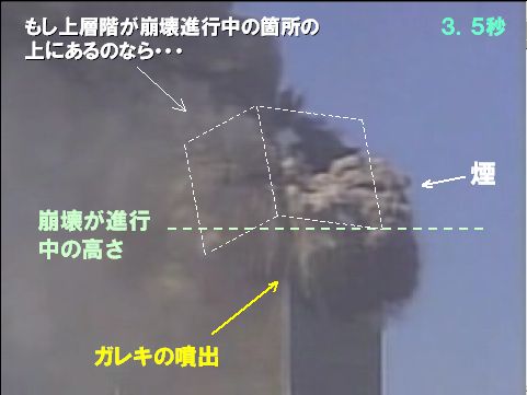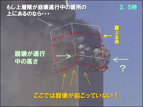 2.5秒の段階で奇妙なことに気付く。もし上層階が破壊されずにそのまま下に落ちたとすると、下の赤い点線の位置にその一番下が来るはずである。しかし東側の角の柱も南東側の壁も元のとおりに見えている。これは北側の角でも確認できる。そして実際に激しく噴煙を噴き出して崩壊が進行中の箇所はそれよりもはるかに上側にあるのだ!
