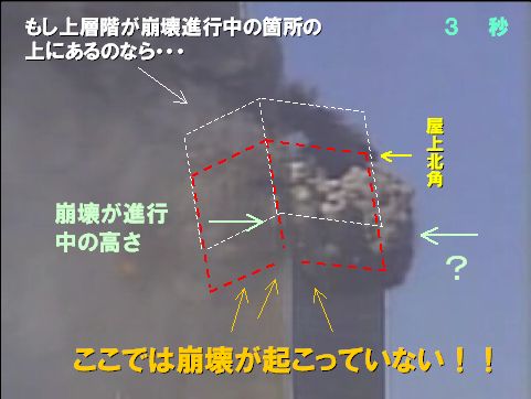 3秒の時点までは北側屋上角の位置が確認できる。上層階はこの位置にあるとしか考えようがない。ここでもう完全に馬脚を現している。上層階がそのままの大きさで下がっていったのなら、どうしていまだに破壊を受けていない箇所が赤い枠内で丸見えにならなければならないのか?