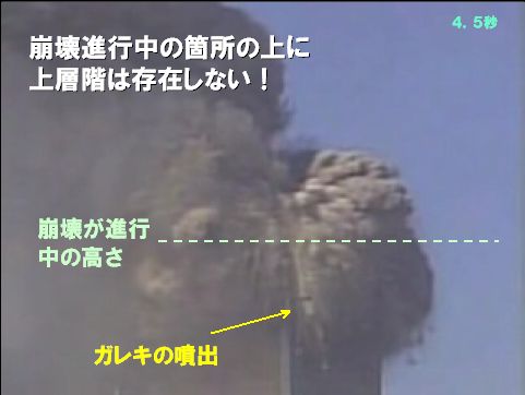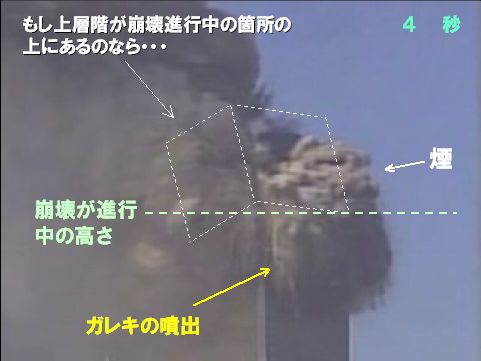 どこで崩壊が進行中であるのかを抜きにして「上層階が噴煙の中に隠れている」などと主張する屁理屈は、このような事実の前に吹き飛ぶだけである。