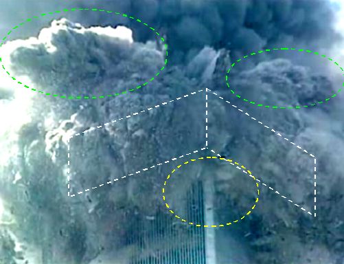 いくつかの説明を加えよう。下の説明用写真で、上の緑色の点線内は単なる噴煙に過ぎず、崩壊中の箇所から吹き飛ばされるがれきではない。下の黄色い点線内にはいまだ建材は外周壁が見えるし、いくつかの粉塵の吹き出しが見える。これらの吹き出しが筒状になっていることは、いまだに床と外周支柱の構造が健在であることを示している。つまりこれらの箇所ではビルの構造の崩壊がいまだに始まっていないのだ。