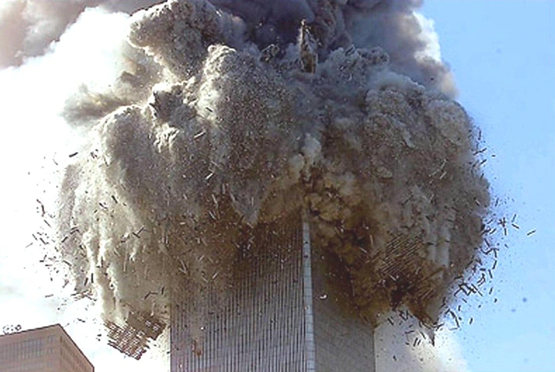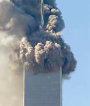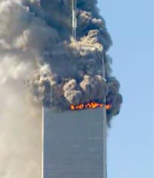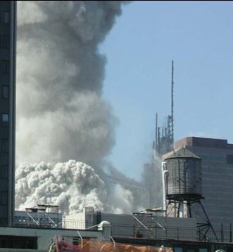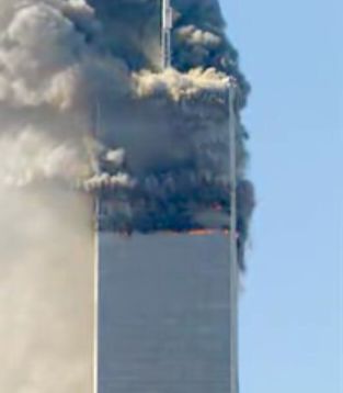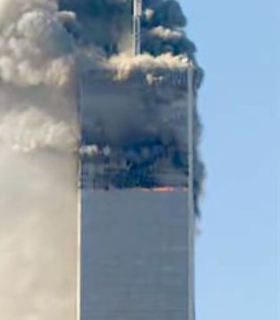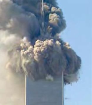 ところが下の左側の写真のように、フロアー部分の崩壊後に十数秒間、コア部分がおよそ280mほどの高さで立ち残っていた。(第2ビルでも約250mの高さで立ち残った。)「巨大なビルの塊」がタワー中央にある大きなコア構造を残して周囲だけを先に押し潰したなど、想像するだけでも狂気の沙汰だろう。