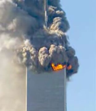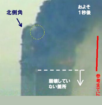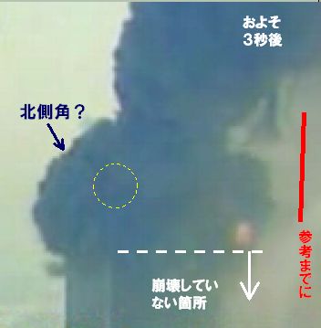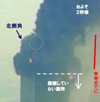 3秒の場面(左側の写真)で、左の下の方にかすかだが赤い炎が見える。これと、南西側から見た写真に写っている赤い炎の位置を比較してもらいたい。この炎のすぐ下はいまだにビルが健在である。これによってもやはり、第2ビルと全く同じように、上層階が傾いていく方向と下の部分の崩壊とは全く無関係であることがわかる。