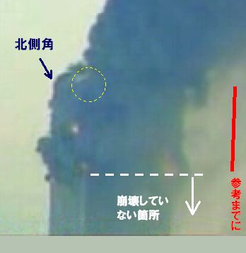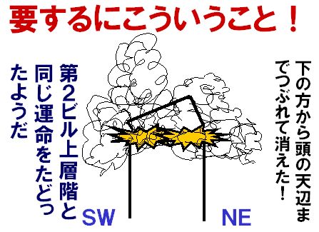 上層階の南西側面はいったいどうなったのだろうか? そもそも崩壊は、いまだに崩壊を起こしていない場所の上で起こっているはずだ。そして激しい粉塵はその崩壊中の箇所から噴き出しているはずだ。実際には「崩壊していない」と確認できる線よりも上の方まで粉塵に隠れた健在な箇所が続いているはずである。