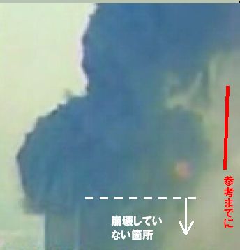以下、左側の各写真で、『崩壊していない箇所』の設定は西側のコーナーが見えている場所で行った。後の方では噴煙が激しくなるために実際にはこの位置より上の可能性もある。また赤い縦の線は、北側の角で測った屋上から崩壊が開始した97階までの距離を示す。南西側の角が見えないために、2枚目以後の写真では「参考」という形で同じ長さを右の方に貼り付けておく。