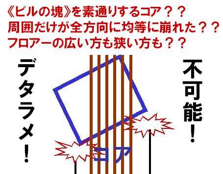 さらに、もしそれがビル中心部、連続写真最後に見るような中心部の「穴」の下に集まっていたとしよう。しかしそうなると『立ち残るコア』でお見せする現象と決定的に矛盾する。ビルの中で非常に大きな部分を占めていたコアの構造が、しかも280mもの高さで、一番最後まで残っていたのだ。さらにそれらが器用にフロアー部分の上にだけ乗っかり、しかもそのすべてをおおよそ均等に同じタイミングで破壊するなどということは到底不可能である。