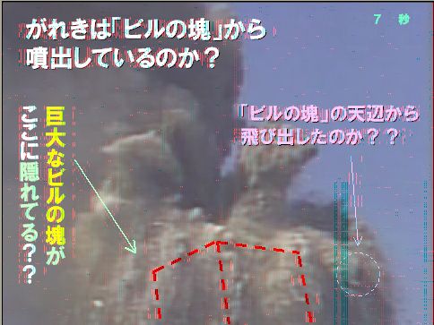 そしてそれがたとえあったとしても、少なくともフロアー全体を覆うような大きさではありえない。第1ビルの崩壊箇所から大量の建材が極めて自由に飛び出しているからだ。建材が激しく溢れるように周辺に飛び散る現象