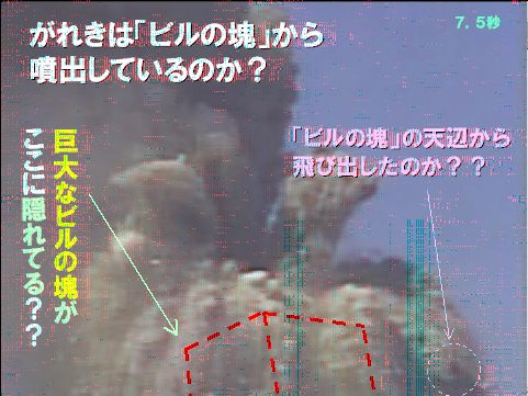 これについては第1ビル「水平崩壊!」の項目で明らかにされることだろう。上層階の名残と思われる大量の物体が滝のように落下していくシーンが証拠ビデオに収められているのだ。