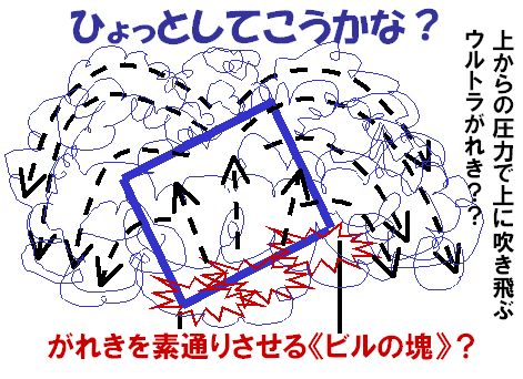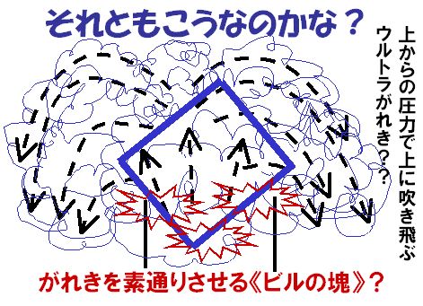 まず、激しく噴き出すガレキは「巨大なビルの塊」の側面から飛び出しているのか?ということになるだろう。