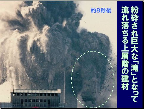 右側の写真で、横一列に噴煙が噴き出している階が崩壊開始の97階があった場所。ただし、ビデオをご覧になれば分かるが、この1秒の時点で崩壊開始の場所の高さは変化していないにも関わらずすでに屋上が2階分ほど(約7m)下がっている。つまり上層階は下の方からつぶされている。(この点はこの911Researchによる分解写真