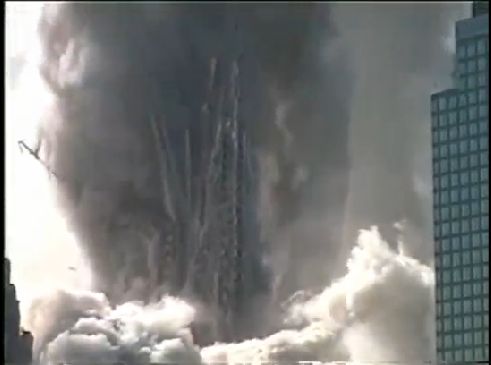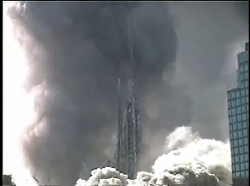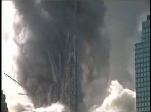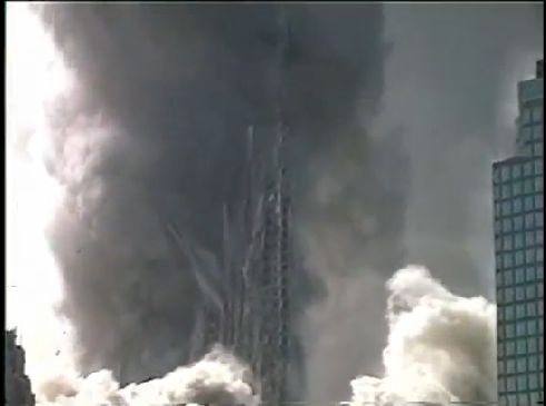 こういったコア崩壊の様子は北方向からも次のように記録されている。これは2008年11月に新たにインターネットに登場したビデオからのものである。幅1m近くもある巨大な鋼鉄支柱がバラバラと崩れ落ちていく様子がよくわかる。