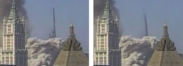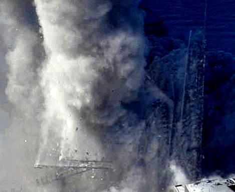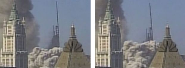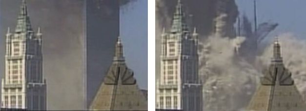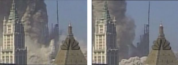 最初の段の左側は元々のビルの位置を示すためのもの。右の写真はすでにフロアー部分の崩壊がほとんど終了した段階で、コアの支柱が激しく右側に倒れていく様子が分かる。
