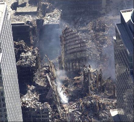 では「三段重ね」のように見えるのだが、最下部は地下の部分であり、中段が地上部の外形、そして上段がコアの部分である。この写真はFEMA(米国緊急事態管理庁)によってまとめられた報告書World