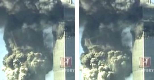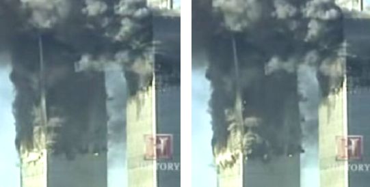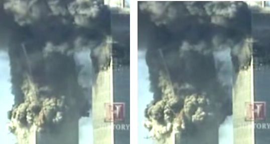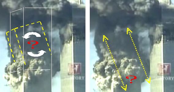 回転しつつある上層階の105階より上の南側角(左側)が折れ曲がっているのだ。また東側(右側)の角も湾曲している。110mもあったビルの塊が変形している のだ。タイミングはちょうど75階からの横一列の爆風 が開始した段階、崩壊開始後約3秒である。