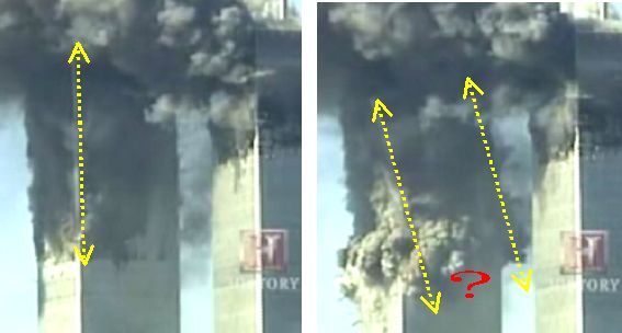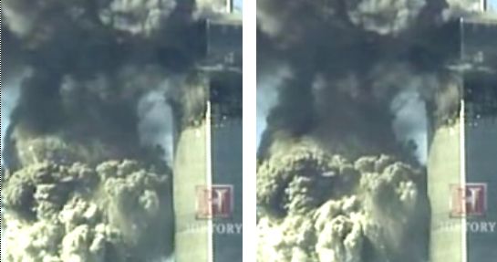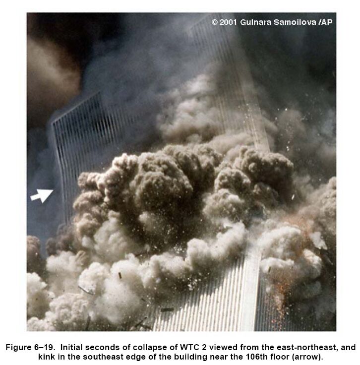 (AP)はNIST(米国国立標準技術研究所)が「WTCタワー崩壊についての報告書」第3ドラフトで矢印まで付け足して掲載したものである。しかしなぜかNISTはその最終報告でこの写真を取り除いた 。