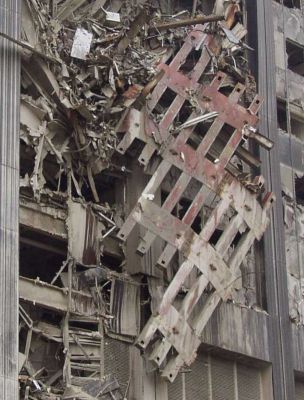 下の2枚の写真は、第2ビルから旧ドイツ銀行ビル(バンカーズトラスト・ビル)の21階あたりに飛んで来てずり落ちながら中に食い込み、そのままぶら下がっている3つの外周ユニットである。少なくとも十数トンの重さがあると思われる。