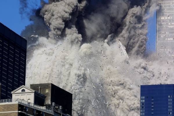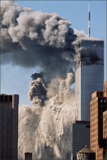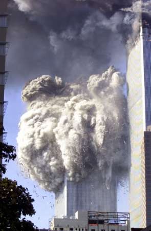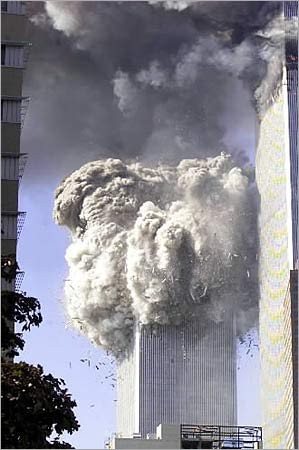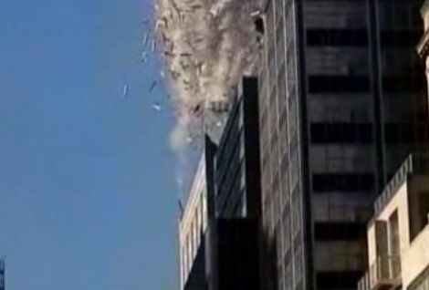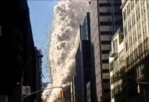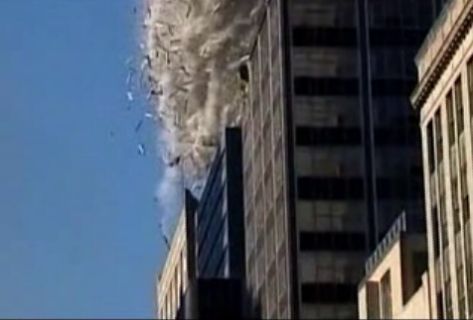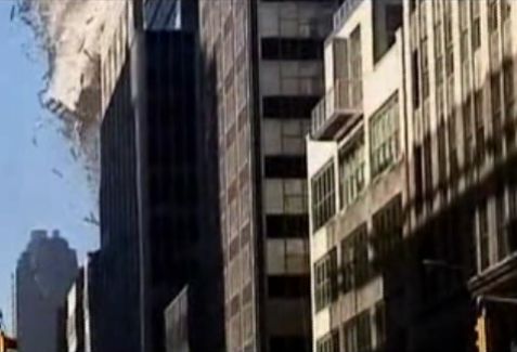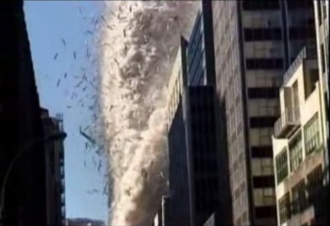 粉砕されたコンクリートなどの建材が巨大な滝のように落ちかかり、様々な大きさの外周建材がその先を飛んでいく様子が、ありのままに撮影されている。(痛ましい話だが、ビル内にいて犠牲になった人々の肉体もまたそれらと一緒にビル外に吹き飛ばされたのであろう。事件後4年以上もたって第2ビルから80mほど南にあった旧ドイツ銀行ビルの屋上−地上171m−から700個にのぼる人骨小片が発見された。)