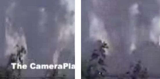 次は西側の遠方から偶然にアマ・カメラマンによって撮影されたビデオからの映像だが、左側の写真はこのビデオの24秒の時点で小さく写っているものである。残念なことにこのカメラマンは7秒間ほどカメラの向きを変えてしまう。7秒後に元の位置に戻ったときには、右の写真のように、コアの姿はなかった。