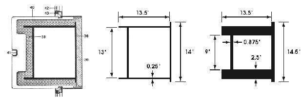 次の図は外周支柱の断面を表している。一番左の図で外側にある「コの字型」で白地の部分がアルミニウム外装板である。真ん中の図は上層階に使用されたと思われる薄い鋼材を用いた支柱、右側は下層階に用いたと思われる分厚い鋼材の支柱である。(数字の単位は全てインチ。)鋼材の厚さでこの中間のものが何段階かあるのかどうか、私には知識が無い。ご存知の方があれば教えていただきたい。しかし常識的に考えれば鋼材の重量がたった2段階しかないようなことはありえないと思うが。