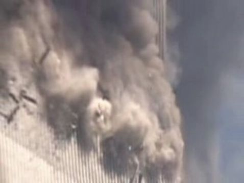 しかしここにもう一つの驚愕させる事実がある。次の写真 は「崩壊開始時の奇妙さ」でも採り上げたものだが、第2ビルの東側の角が潰れて崩壊が開始して0.5秒ほどしかたっていないが、この時点で上から外周の建材が落ちてきている。