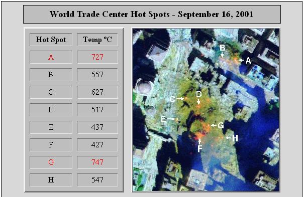 そこで、観測衛星で調べられたグラウンド・ゼロの表面温度の分布を調べてみよう。これは2001年9月16日の記録である。第1、第2、第7の3つのビルの跡地に非常に高い温度があることが分かる。
