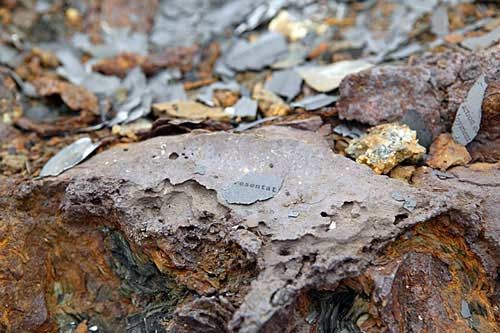 物体の表面。紙切れがその上で焦げた状態になっているところを見ると、取り出されたときにはまだ相当の高温だったのかもしれない。(燃える紙はこんな状態にはならないだろう。)またその表面の様子はいったん熔けたものが固化したようにも見えるが、どうなのか。