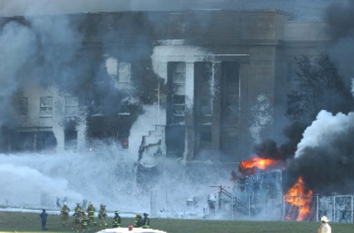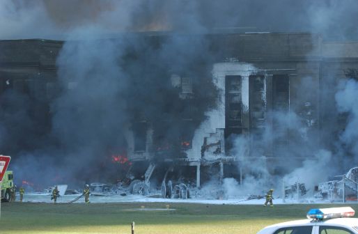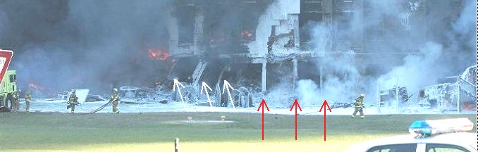 次の写真は上の写真から何分か後に撮影された。Eリングとジェネレーターの火は消され、外壁の様子がよくわかる。中央やや左側で奥の方に赤い火が見えている場所が「77便の機体が突っ込んだ」とされる箇所だ。