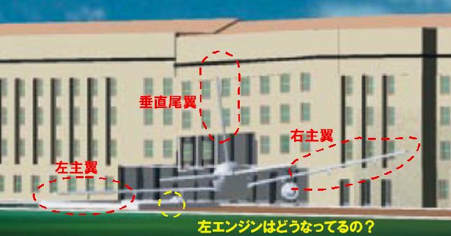 この図によると、1階部分の柱の消滅を、胴体のほかに左右の主翼の内側とエンジン部分の激突によるものとしているようだ。しかしこれではいくらなんでも左主翼が低すぎる。もう少し全体を上げるか機体を真っ直ぐにしないと左エンジンが地下を通ってしまう。この図は飛行機の位置と角度を多少フレクシブルに動かしながら考えないと仕方があるまい。