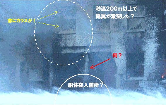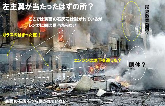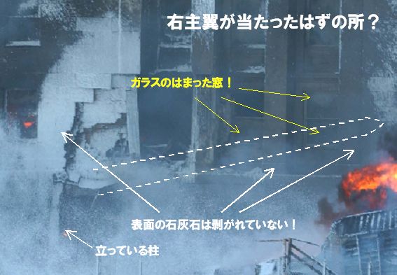 あるいは、激突のショックで主翼の先半分と尾翼が壁に激突する前に千切れてどこかに飛んでいったが、そこが《たまたま偶然に》写真に写らない場所だった、とか何とか、かのありがたい《グーゼン様》にすがって逃げる以外に手が無いだろう。