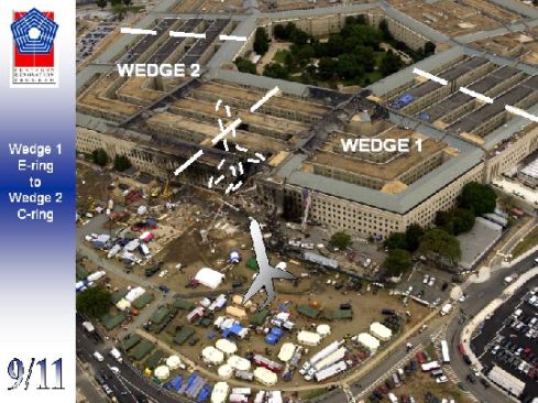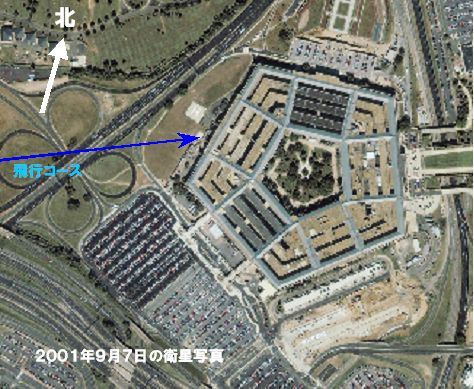 ペンタゴン当局の公表によると、2001年9月11日午前8時37分、ハイジャックされたアメリカン(AA)航空77便が下の写真のようなコースをとってペンタゴンの西側の壁に激突したそうである。上側に黒い屋根の部分があるがここにラムズフェルド国防長官、ウォルフォヴィッツ国防副長官を始め、ペンタゴンの主要人物達がいたはずである。どうやらテロリストは最も標的とすべき者達をわざわざ避けて工事中の箇所に飛行機を激突させたらしい。まあどうせこれは《偶然》