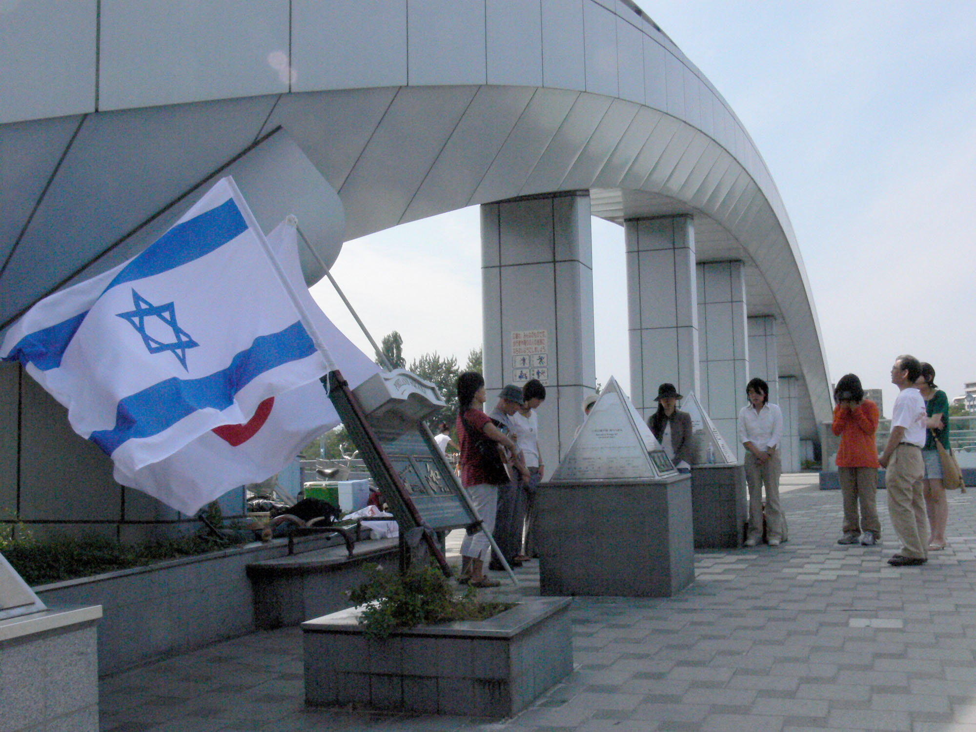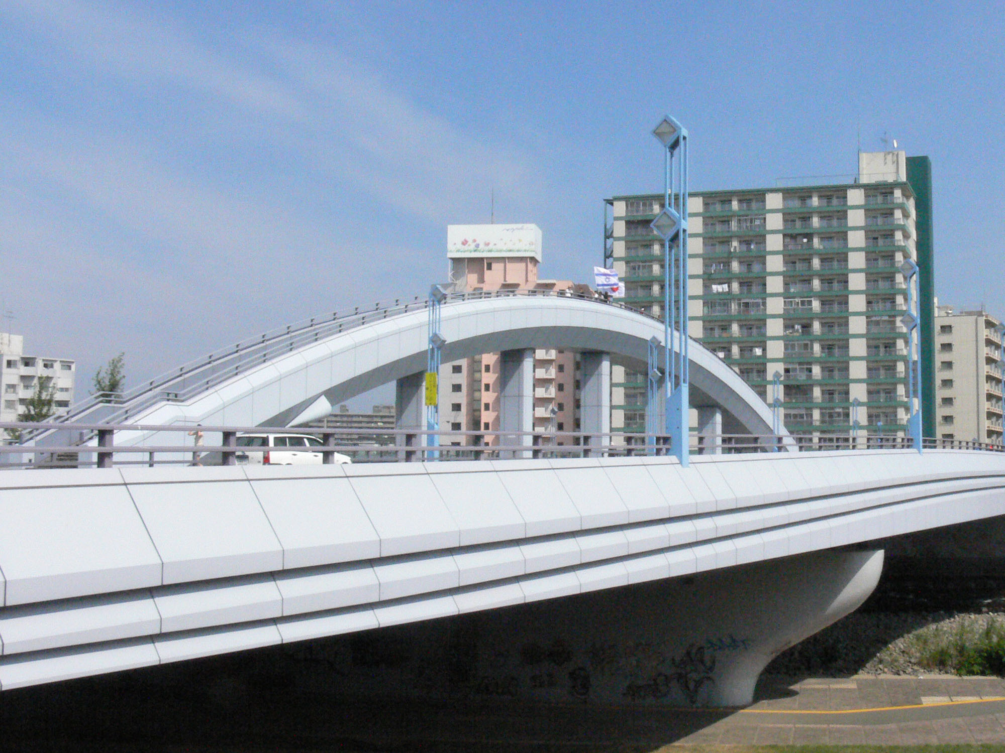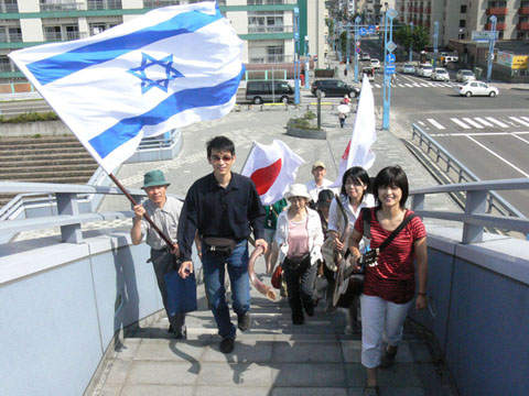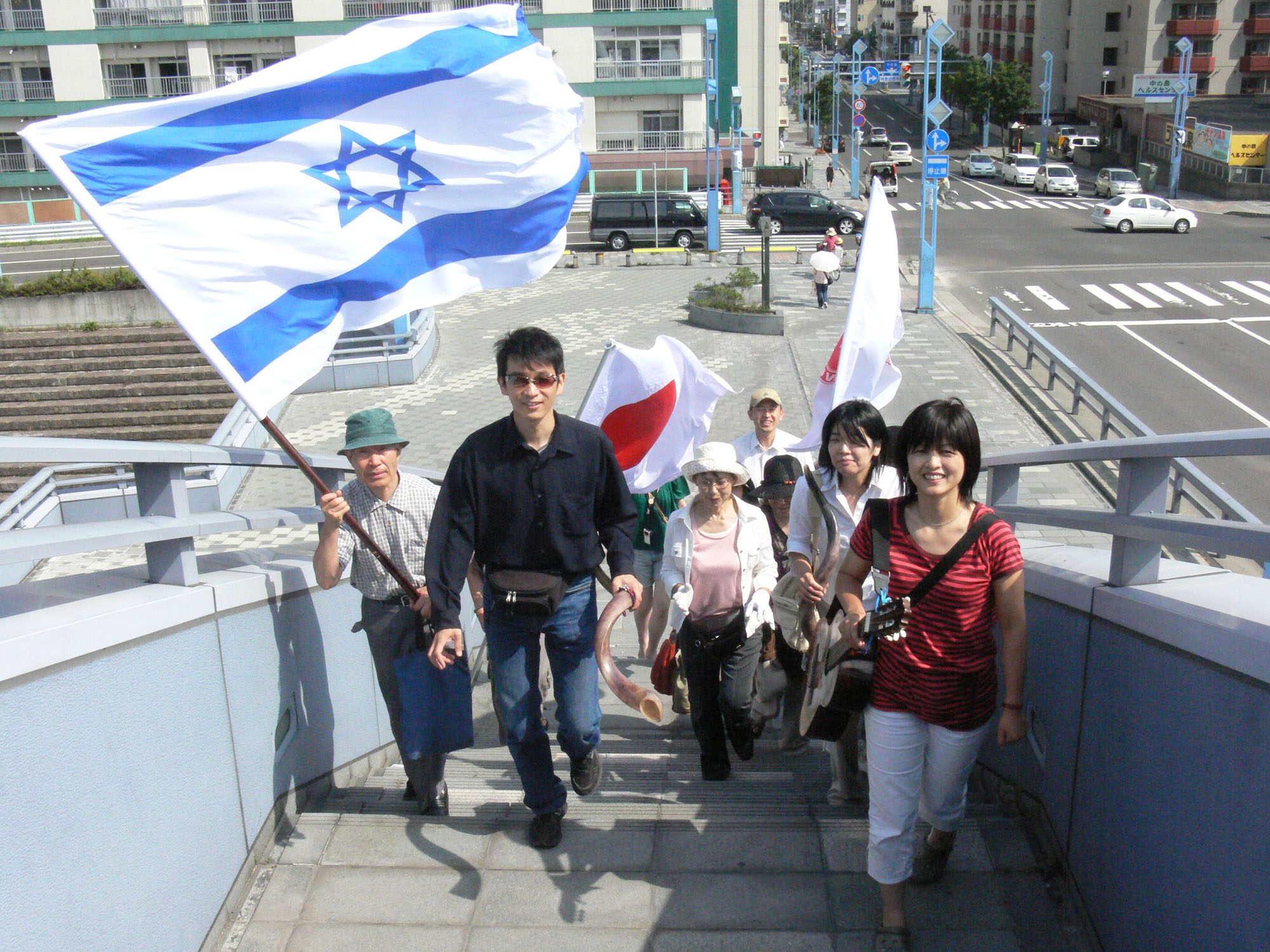 約束の時間の午後2時の10分前に橋の上に昇り始めました。それぞれが旗や角笛や楽器を手にして我々が一つのチームとして階段を一歩一歩昇り始めるにあたって、我々は文字通りエルサレムに向かう「都上り」の気分で、いやおうなしに心は期待感で高揚していきます。
