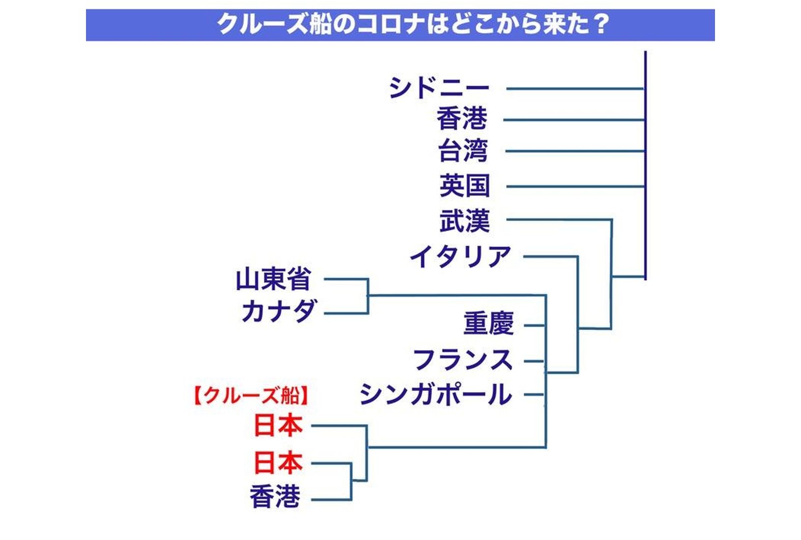 それは中国です。中国から欧州に移動したウイルスがクルーズ船のウイルスとつながっていることがわかります。